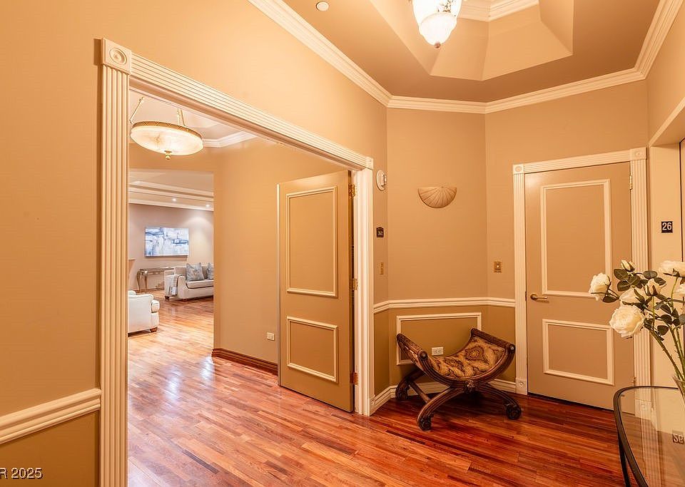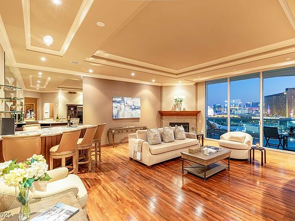 Rare High-Rise Opportunity on the 26th Floor! Panoramic views of the Las Vegas Strip, Downtown & surrounding mountains. This spacious 2,805ft.² residence includes 379 ft.² of private balconies, perfect for entertaining or relaxing above the city lights. A private foyer welcomes you into an expansive living area featuring a fireplace & bar. 3 beds, 3 baths, laundry room w sink & cabinets & electric shades throughout, 2 parking spaces. HOA fees includes: Water, gas, Valet parking, Concierge, limo service, 24/7 security & more! Also,The Stirling Club located on the property grounds, offers Full-service spa, salon, barbershop, massage, facials, nails & + Exceptional Fitness center, Indoor & outdoor pools, sauna, Tennis & pickle-ball courts, Fine dining, bar, cigar lounge, Starbucks, wine cellar, tasting room & private event spaces & much more! Don’t miss this exceptional opportunity to live in one of Las Vegas' most coveted luxury towers. Make your move today!