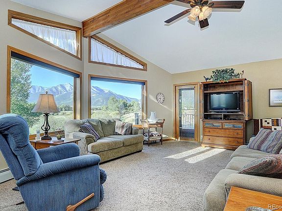 Nestled in a picturesque setting overlooking the golf course with stunning views of Mount Princeton, this beautifully maintained home combines comfort and style. Large windows in the living room frame the serene landscape, filling the space with natural light. This well-appointed, three-bedroom, two-bathroom home offers single-level living at its finest, featuring oak flooring throughout the kitchen, and dining room. Step onto the covered front porch or enjoy the deck off the living room, perfect for soaking in the surroundings. A two-car attached garage provides convenience, while laundry hookups complete the main level's functionality.