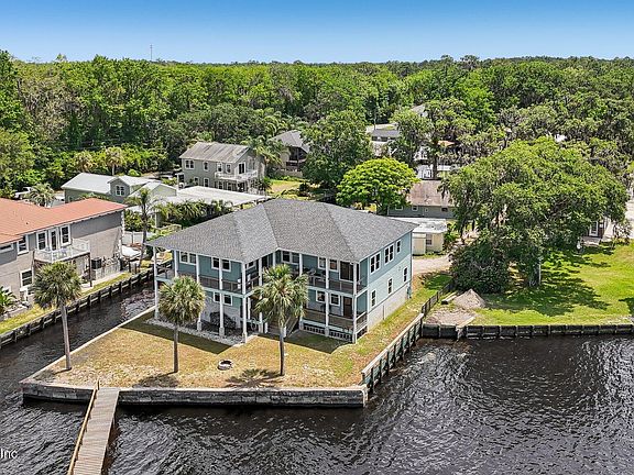 Paradise on the St. Johns River. This Perfect Retreat -CBC-boasts 140 ft of Riverfront AND 112 Ft of Canal Front. Dock rebuilt in 2024. Great views from every room! Incredible flexibility in this floor plan. The main living space-upstairs- has the Owner suite, spacious w/extraordinary river views, huge dressing room and laundry. Kitchen w/ massive lsland, cabinets reclaimed from original home, oven tower, 5 burner gas cooktop, farm sink, all open to family room and open office, massive pantry, and second bedroom with walk-in closet and ensuite bath. Main floor has separate living quarters, a bedroom, full bath, family room, kitchenette, laundry/utility room and hobby room, this space is perfect for generational living or possible income gen. Huge garage w/ cooled workshop area. New 60ft bulkhead on western side, 850sf of covered decks on front and back of house both upstairs and down. Septic-Advanced System-Water two wells. Yard with firepit and boat ramp