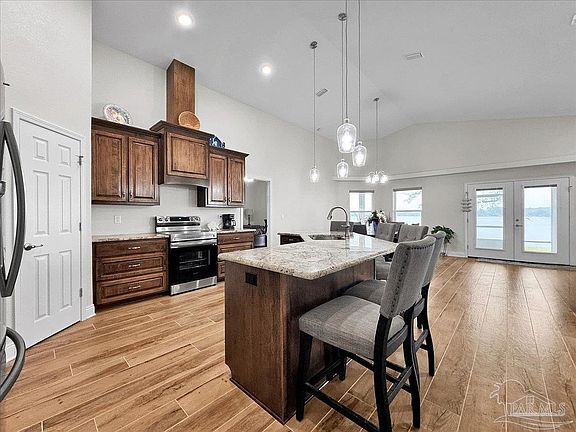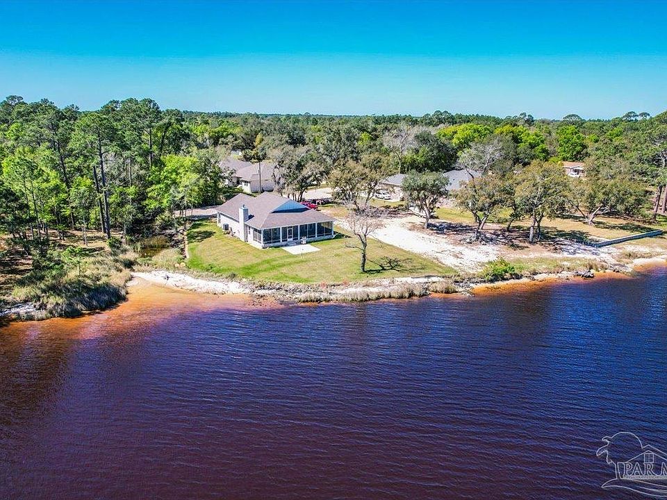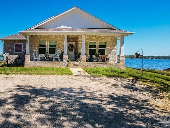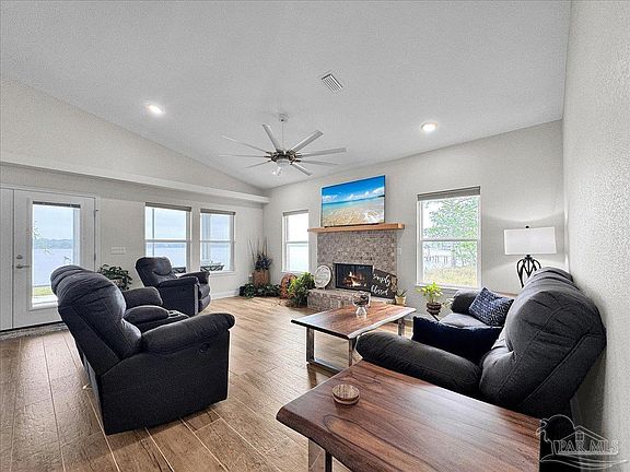 Huge Price Improvement! This fabulous all brick 3 bedroom 2 bath home boasts breathtaking 180 degree views of pristine East Bay. Enjoy peaceful sunrises and unbelievable sunsets. Custom built in 2023 this stunning home features an open floor plan with soaring ceilings, wood burning fireplace, tile floors throughout, windows all the way across the back of the home and a huge screened porch for the best bay views in Navarre. Family friendly eat-in kitchen with granite countertops and smooth top stove. The waterfront master bedroom includes a raised boxed ceiling, glass french doors leading to the porch, oversized masterbath with garden tub, separate tile shower and his and hers walk-in closets. Florida living at it's best! Don't miss the oppurtunity to own this fine home