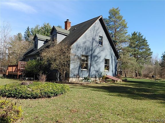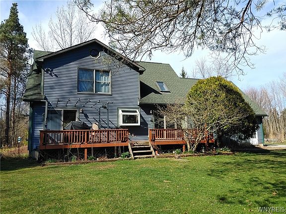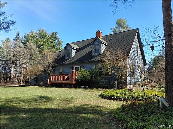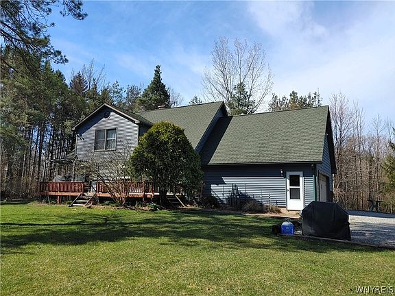 Custom Built Cape Cod on 16.588 wooded acres with paths and a pond, in the Town of Wilson. Country living at it's best, feel the privacy and serenity as you drive up the tree lined driveway. If you love nature/hunting this home is perfect for you! The large windows throughout the 1st floor light up the open floor plan. Watch the wildlife through the garden window above the sink in the kitchen. A professional Viking stove is included for the cook of the home. Enjoy the pellet stove in the living room for cold winter nights and as an alternative heating source. Sliding glass doors in the Sunroom and Dining area lead to the large deck out back. Contemporary Cathedral ceilings and windows are part of the 2 large bedrooms upstairs with walk-in master closet. Maple hardwood flooring throughout the first floor. Walk-in Pantry. Invisible fence and chain linked area included for your animals. Home is expandable to 1 more bedroom over the garage. Showings begin at the Open house on April 13th and 14th, 1-3pm. Offers can be submitted starting April 14th @ 3pm.