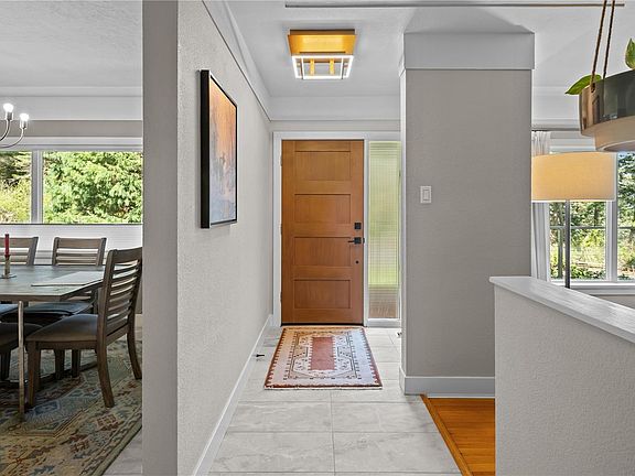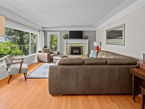 Tucked away on a quiet no-through road in Ten Mile Point, this beautifully renovated 1950s home sits on an 11,000+ sq ft lot, just steps to the ocean and parks. Thoughtfully updated throughout, it features a custom kitchen, hardwood floors, fir doors, energy efficient windows, 300 amp service, and a new furnace and heat pump. The main level offers a bright, open layout with a gas fireplace, forest views, and a natural flow connecting the kitchen, dining, and living areas. The spacious primary bedroom, two additional bedrooms, and a stylish full bath complete the main floor. Downstairs includes a large laundry room, an additional bedroom with ensuite, and a brand new one bedroom legal suite with its own entrance. The fully fenced backyard is a landscaped retreat with raised garden beds, curated plantings, and a large cedar deck with ocean glimpses. A rare offering in a prime location near beaches, trails, schools, and Cadboro Bay Village.