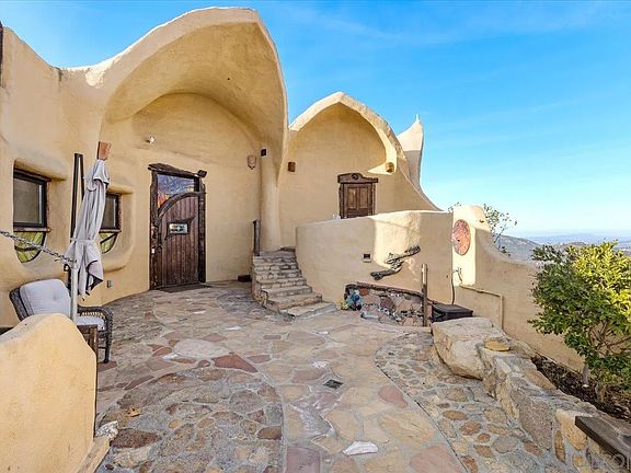 Artist's Paradise. Custom designed for this site by world renowned artist/architect James T. Hubbell. Perched about the valley below and offering panaramic 360 degree views from the mountains to the Pacific. Main home has too many artistic features to list here but include: Stained glass windows, myrtle wood steps and thresholds, sculptures, hand cut tiles, 2 fireplaces, view decks, etc. Super private and secluded yet 7 minutes from the 15 freeway. Fully permitted guest studio over garage.