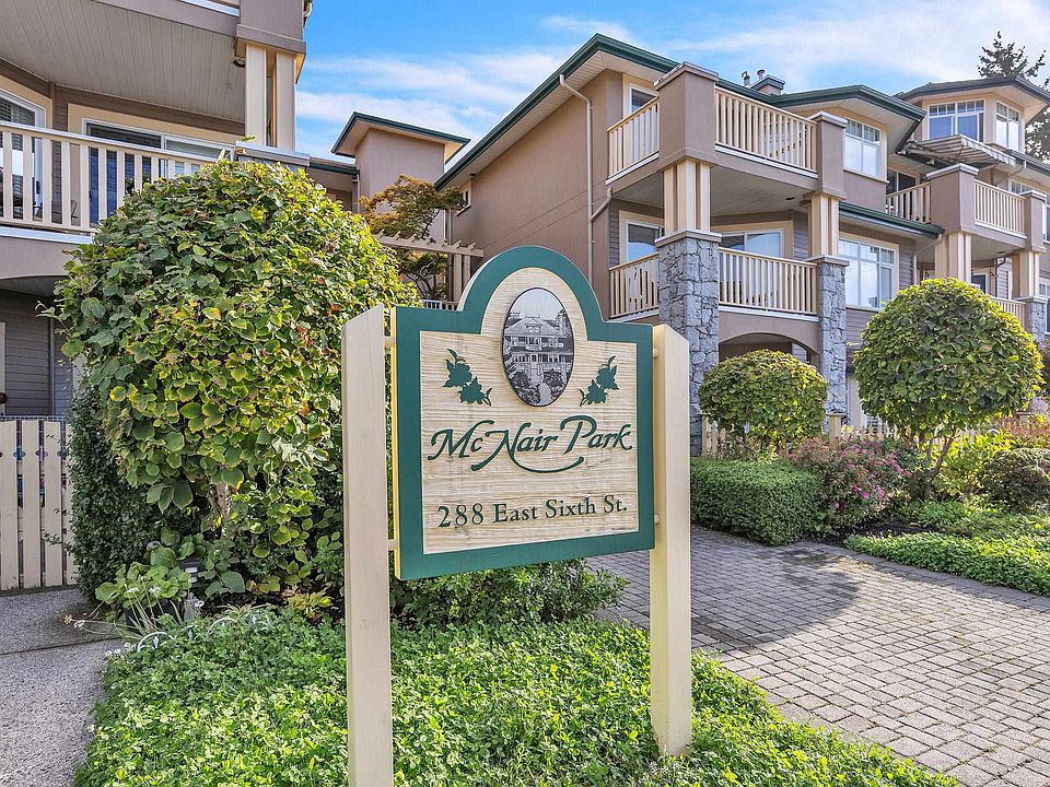 Rarely available 3-bed, 2.5-bath corner townhome in coveted McNair Park! This home is the best location in the complex offering 1,545 sq ft of bright southwest living, this 2-level home features oak hardwood floors, house-sized rooms, and two sundecks including one off the primary bedroom. The open kitchen has an informal eating area, while the spacious living room is anchored by a cozy gas fireplace. Perfect for families or downsizers, with 2 secured side-by-side parking stalls, a large storage locker, bike room & workshop. McNair Park, built by Brody Construction, is known for its lush gardens and courtyards. Exceptionally maintained strata with new roof (2019), exterior paint (2020) & both elevators replaced. Quiet, tree-lined street in Lower Lonsdale. Open Sunday 2-4pm (October 5th).