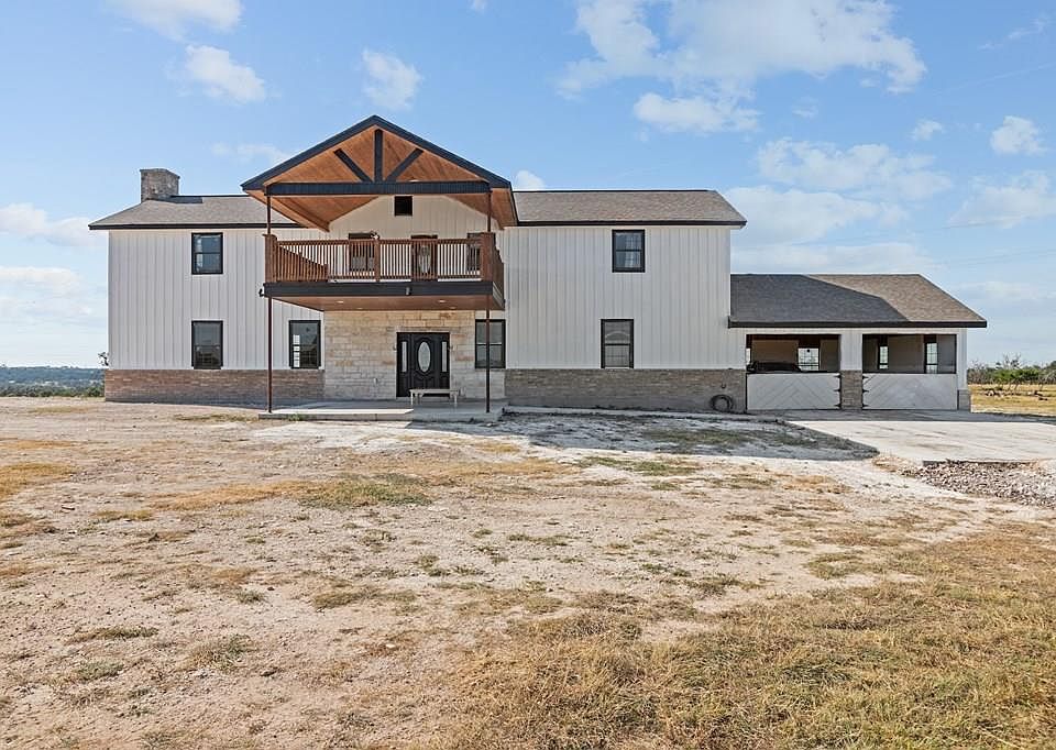 Enjoy peace and quiet in the well-established Longhorn Ranch neighborhood. Nestled on over 9 acres with perimeter fencing, this property offers panoramic views in every direction from expansive front and back decks. Inside, the home welcomes you with a stunning rock fireplace and matching accent wall, creating a warm and inviting living space. The kitchen boasts a unique rock island, rich wood countertops with coordinating backsplash, and a walk-in pantry cleverly tucked beneath the staircase for extra storage. The primary suite is conveniently located on the main floor with direct access to the spacious laundry room. The primary bathroom offers plenty of room to unwind, complete with a tiled walk-in shower. Upstairs, a large central sitting room is flanked by two bedrooms and a full bath—perfect for family or guests. French doors lead from the sitting area onto both the front and back decks, making it easy to take in the sweeping Hill Country views from sunrise to sunset.