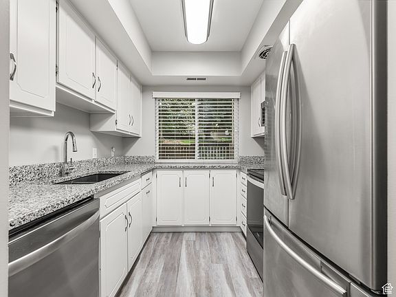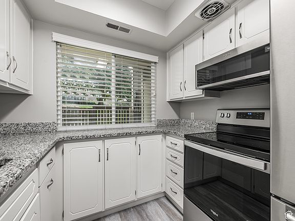 Welcome Home! This beautiful 2 bed 2 bath ground-level condo in the sought-after Three Fountains is ready for you! This community is very well taken care of and this corner unit condo backs up to a picturesque common area with plenty of green space and mature trees. As you walk in you will notice the wonderful updates throughout which include a renovated kitchen with multiple upgrades: granite countertops, composite sink, high arc faucet, garbage disposal, fresh paint, new stainless steel range and microwave, dining lighting, and flooring. The condo comes with two covered parking spots, is wheelchair accessible, and has a community pool! Reach out for a private showing!