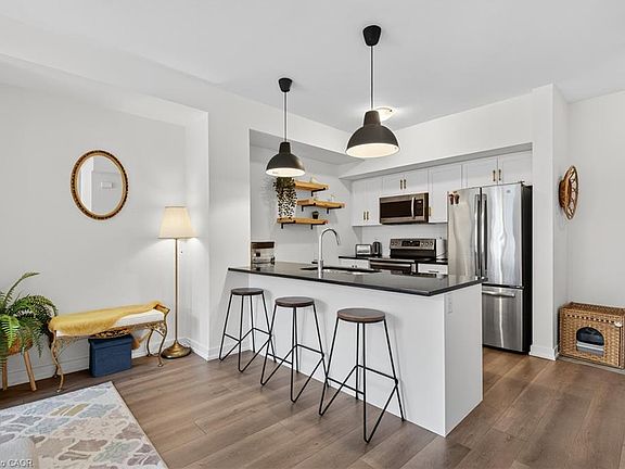 Open-concept layoutWide plank vinyl flooringStylish upgraded lightingGourmet kitchenSleek white cabinetryStainless steel appliancesGranite countertops