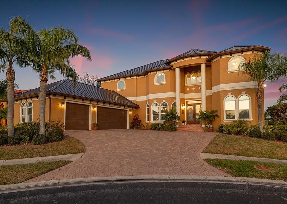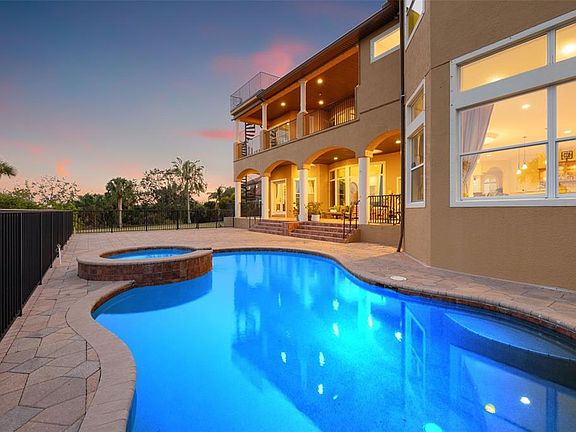 Luxury living with an abundance of privacy, amazing views, an open floor plan, and ample closet space are just a start. This cul-de-sac custom-built home of unparalleled elegance within a gated enclave features breathtaking water views and gleaming natural light without compromising privacy. Spanning 5,260 square feet, this 2 story meticulously designed residence features 4 bedrooms, study, game room, retreat room, 6 bathrooms, an elevator and an extended 3-car garage. Step inside to soaring ceilings, coffered detailing, and expansive windows with abundant light as well as privacy. This gourmet kitchen is a chef’s dream, outfitted with a top of the line Wolf range, stainless steel appliances, built-in ovens, microwave, beverage fridge, and generous walk-in pantry with attached second refrigerator. The open-concept kitchen, family room, breakfast nook, and transitional area provide a seamless flow for both everyday living and entertaining with direct access to covered patio. The main level also hosts spacious living room, bedroom with a full bath, and game area. Hardwood stairs, elevator and exterior spiral staircase connect to the second floor. The primary suite is a private sanctuary featuring an opulent ensuite bath, a custom walk-in closet with an organizing system, and breathtaking, unobstructed bay views with patio access. Large second-floor retreat room offers more opportunities for relaxation and gatherings. Outdoor living is unparalleled with two covered patios and a third-floor crows nest all with panoramic water views of Tampa Bay, and a custom-designed saltwater Pebble-Tec pool & spa to enjoy Florida’s year-round sunshine. The extended garage features larger doors, and built-in closets for maximum storage. Built with both style and security in mind, this home includes hurricane clips, fabric shutters, and remained high & dry during Hurricane Helene & Milton. A brand new high-end aluminum roof (2024) adds lasting durability for years to come. Enjoy your resort-style amenities and a prime central location with less than 30 minutes from St. Pete/Clearwater International Airport, Tampa International Airport and top-rated private and public schools. Within the hidden treasure of Pinellas County, you are close to great shopping, specialty dining, and Florida's beautiful gulf beaches. Discover the pinnacle of Luxury, privacy, and serenity within this unique home that can be yours today.