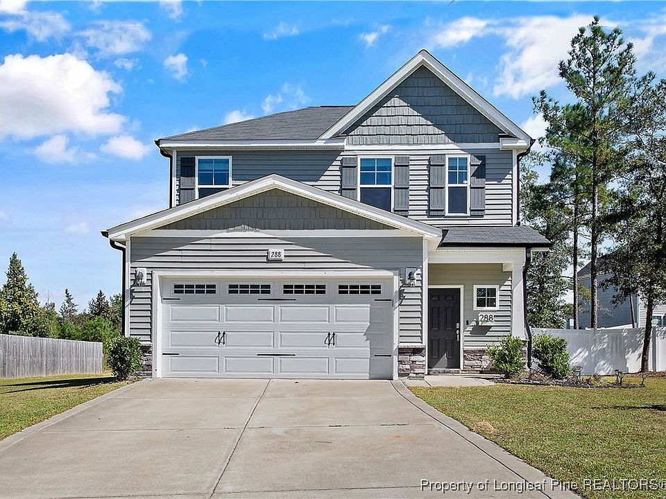 This spacious and inviting home features an open floor plan with a cozy living room, dining area, and eat-in kitchen. Laminate flooring throughout first floor. Kitchen has granite countertops, lots of cabinet space, stainless steel appliances and an island. Upstairs, you'll find three bedrooms, including a large master suite with walk-in closets, dual vanity and a private bath. The home also includes a two-car garage and fully fenced yard. Located in the desirable Lexington Plantation community, where residents enjoy amenities like a swimming pool and park. Close to shops, restaurants, and Fort Bragg.