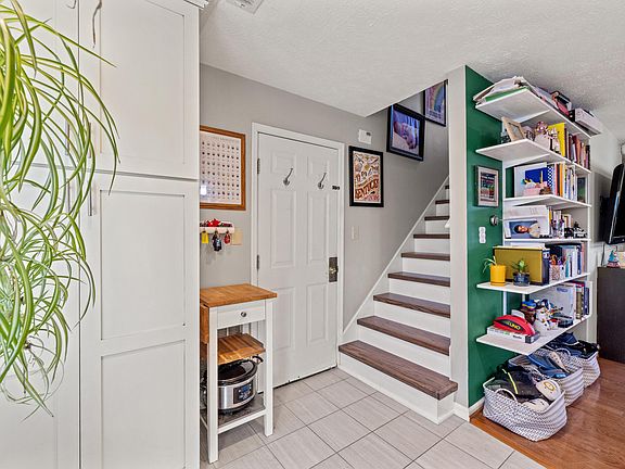 Recent updates include solar panels, newer roof, tile flooring and brand-new wood stairs leading up to second floor.