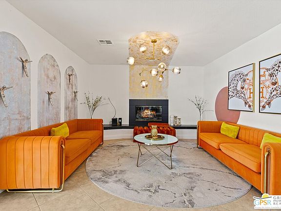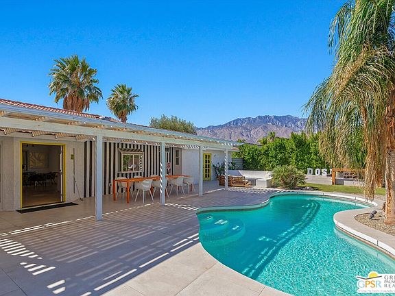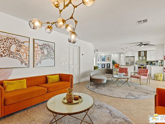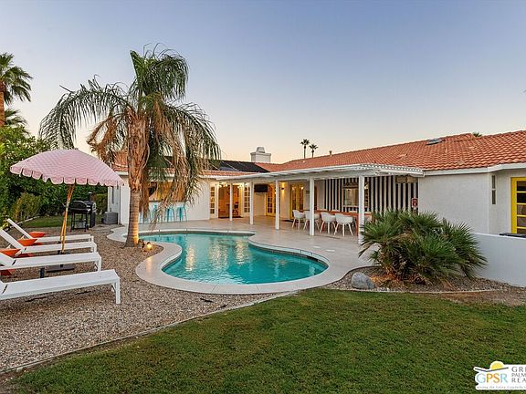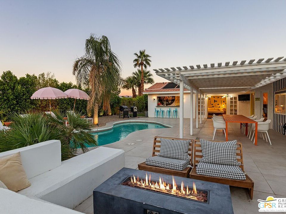 Maximalist Palm Springs Vibes! Offered turnkey furnished, this spacious ranch home has received a glow up to infuse a chill resort style inside and out. Featured in an episode of Staycation on CBS, the designers have created an instagram-worthy home that has operated as a successful vacation rental for several years. Set behind a ficus hedge, the home maximizes recreational use front and back. Interiors are dramatic and include a renovated kitchen with Bosch appliances, soft-close cabinetry, and a striking custom Italian granite slab center island. The dining area includes a service bar with ice maker and beverage cooler. The living area is anchored by custom wall treatments and a gas fireplace. There are three uniquely appointed bedrooms and two bathrooms in the main home, including the resort-size primary which boasts a spacious spa-inspired bathing area, and the suite has French doors opening to the backyard. Rare in this neighborhood, the home has an attached casita with separate entrance, spacious bedroom, generous bath with soaking tub, and a kitchenette with a roll-up window that creates a service bar for the leisure area - perfect for pool party season! Offering a roster of additional service amenities like owned solar, free-form saltwater pool, putting green, hot tub, firepit, BBQ, pizza oven and a 2-car garage currently used as a game room, there's no reason for guests to leave! As of 10.16.2025, there are currently two wait-listed STVR applications for the Gene Autry neighborhood, so realizing this as an investment property can begin immediately with a junior certificate while waiting for a general license. (Buyer to confirm and investigate all details of rental process.)