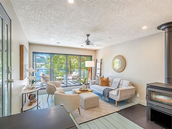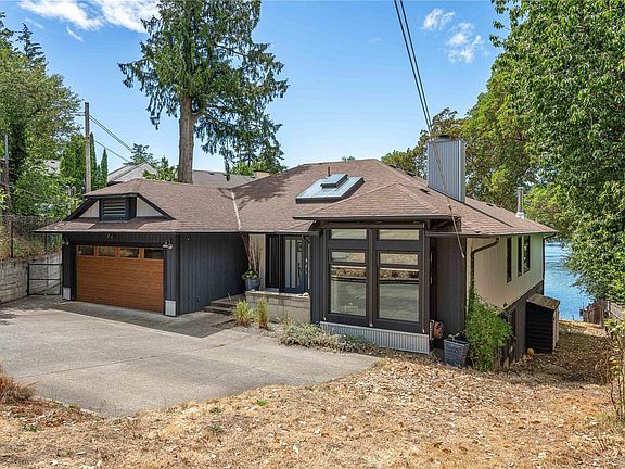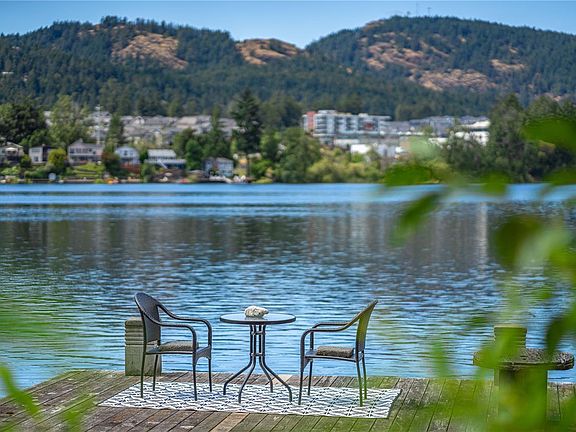 Lakefront living on Langford Lake—this executive home offers waterfront privacy only moments from town centre. Set on nearly 0.5 acres, it combines main and summer home living. Numerous upgrades ensure luxury living. The home provides total privacy w/ main level living & suite below. Walls of glass offer panoramic lake views from the great room & primary retreat. The kitchen boasts updated appliances, shaker cabinets, large island, gas cooktop & ample natural light. Wide plank hardwood floors, board & batten ceiling, skylights, wood fireplace & coved wood ceiling add charm. With 3 beds up, a 4th down, a rec room & separate suite, this home can accommodate a large family or provide income potential. Outside, enjoy patios, a fire pit, gardens, a large shed & a dock. Features include a double car garage, gated driveway, ample parking & covered RV parking. Langford Lake, an electric motor-only lake, ensures serenity. Steps from the YMCA, close to the highway & amenities!