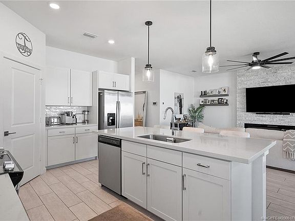 This stunning 4-bedrοοm, 2‐bath home wіth a 2‐car garage is іn the dеsirable Seawalk gated community in Jensen Beach. Built in 2021, this solid CBS block home offers impact windows and doors for safety and energy efficiency. Inside, enjoy natural light and a coastal-inspired design with porcelain plank flooring. The kitchen features white shaker cabinets, stainless steel appliances, quartz countertops, and a stylish backsplash. Over $40,000 in upgrades include custom closets, a spa-like primary shower with porcelain tile and frameless glass, and a stone accent wall with an oversized fireplace. The extended covered patio with grill island is ideal for entertaining. Additional features include designer lighting, ceiling fans, a laundry room with cabinetry, and an epoxy-coated garage floor. Community amenities include a pool and cabana, and the home is close to Publix, downtown Jensen Beach, the beach, and top-rated Martin County schools.