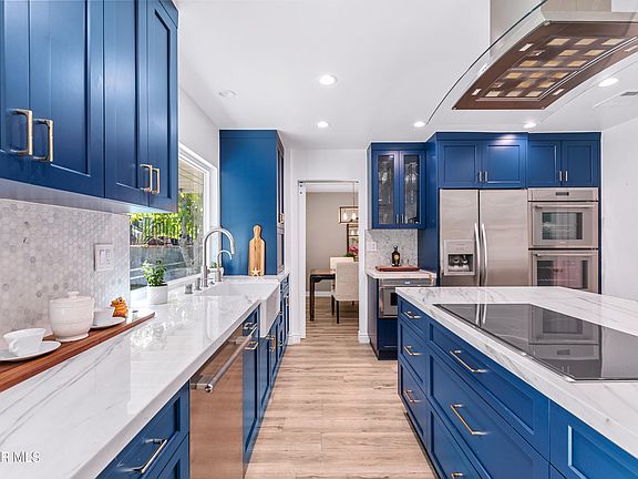 Bright & cheerful, this upscale 5-bedroom home in Agoura Hills will WOW you! It features an HGTV-inspired blue & white kitchen, family & pet friendly wood-like floors, a remodeled primary bath, double pane windows, newer lighting, recent exterior paint and upgraded electrical. The secondary baths were remodeled as well. The kitchen was reconfigured & redone 2 years ago including cabinetry, slab counters, marble backsplash, new island with loads of storage, and a large picture window. It also offers Thermador stainless steel appliances. This versatile model has a bed & bath downstairs, a 3-car garage and the bedrooms are surprisingly good-sized. (Downstairs 1/2 bath can easily add a shower.) Notice there is no house directly next to it on the left which gives you more space & seclusion. If you like a private, woodsy backyard, you'll be thrilled to see an elevated deck and lots of trees. So many rooms in the house have this tranquil view to the backyard! Walk to Las Virgenes' LSTEM Sumac elementary and the Mariposa School of Global Education, a Waldorf inspired public school that offers K-8. Convenient location in the heart of Agoura Hills, near shopping & restaurants. Hiking is close by and the beach is about 20 mins away. This is the ONLY 5 bedroom & the only one w/a 3 car garage for sale in Agoura & Westlake under $1.5 M!