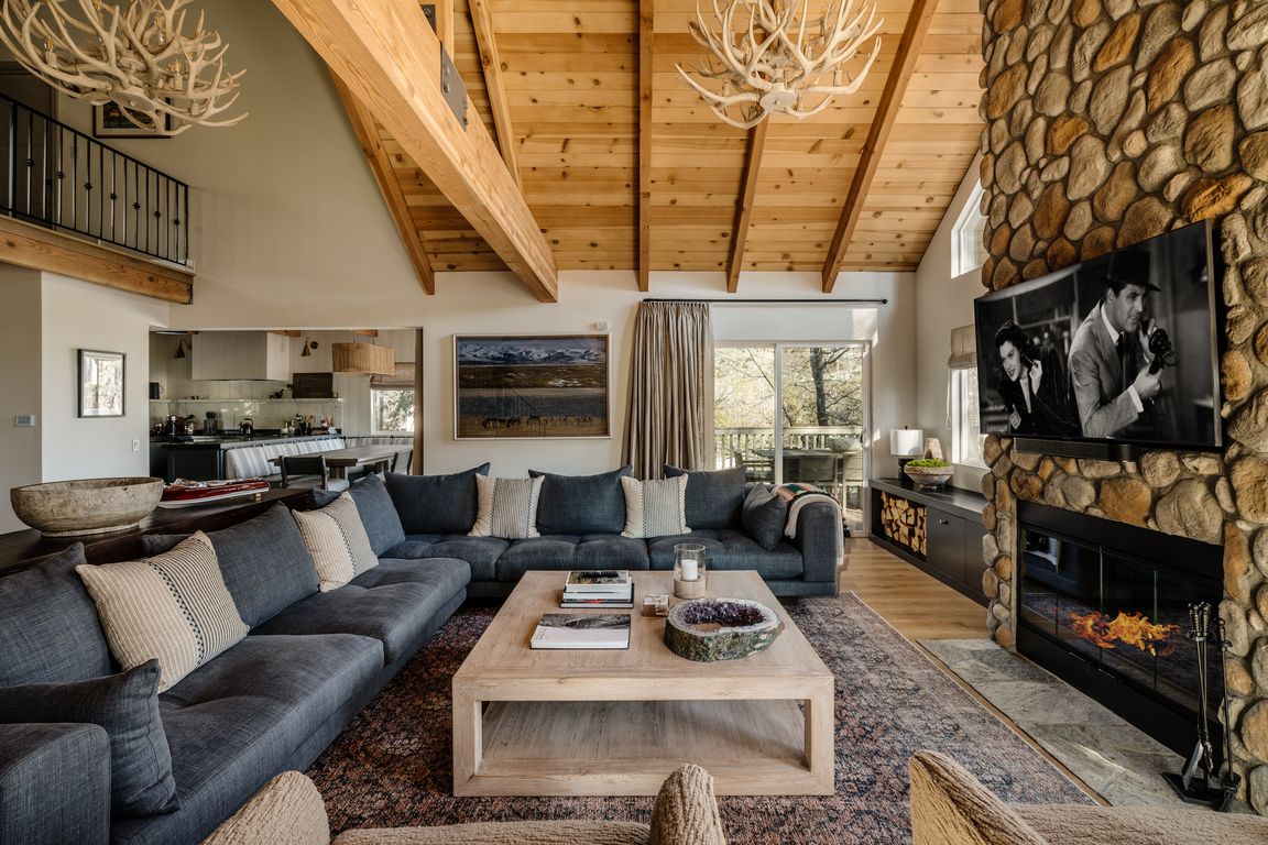 Lakeside Mountain Haus. This home is a true showplace and an entertainers dream. Beautifully remodeled and fully furnished, this turnkey Lake Arrowhead Lodge is located in the prestigious gated community of North Shore Estates. This high end remodel was designed by an award-winning interior specialist. The residence exudes elevated mountain style with curated finishes, custom details, and a welcoming aesthetic. Generous indoor and outdoor living spaces and modern upgrades make the atmosphere amazing. The living room greets you with soaring wood-beamed ceilings, a striking floor-to-ceiling stone fireplace, and an inviting, warm energy. A whimsical swing in the entryway sets the tone--leave your cares behind, relax and enjoy. The chef's kitchen is stunning with custom cabinetry, premium finishes, and a built-in dining nook - perfect for morning brunches or festive evenings. A main-level bedroom offers convenience and flexibility, while two additional upstairs bedrooms feature vaulted ceilings and peek-a-boo lake views. A lovely library loft overlooks the living room, ideal as an office or reading space. The lower level is a total mood change - a stylishly renovated den with its own fireplace and a full bath, making it a comfortable and private sleeping quarters or - a great space for your primary suite. Step outside to enjoy multiple outdoor spaces, including a large front deck, an oversized wrap around back deck, a lower patio, and your own private hot tub with custom hardscaping, beautifully surrounded by mature oaks, pines and vibrant maple trees. Whether you're sipping morning coffee or stargazing at night, you'll be peacefully immersed in nature. Additional smart home features include with keyless entry and remote thermostat access, A/C, an EV charger, with a water filtration system in the kitchen. Private driveway leads to tons of parking. Upper driveway for main level entry, lower driveway for level entry into the den, an attached garage and covered parking next to the garage. Plenty of room for several cars and a boat. Easy access to the Lake and Lake Trail plus The residence comes with a Dock House (shared ownership), an architecturally notable structure designed by David C. Fowler and photographed by Julius Shulman. Looking for the entire Lake Arrowhead package? - You can have it all - Dock Slip and Boat are available for additional $. This is your chance to own a fully furnished, designer-renovated mountain home in one of Lake Arrowhead's most desirable lakeside communities. Experience a true four-season Alpine Mountain Resort - situated within 2 hours from most SoCal Cities.