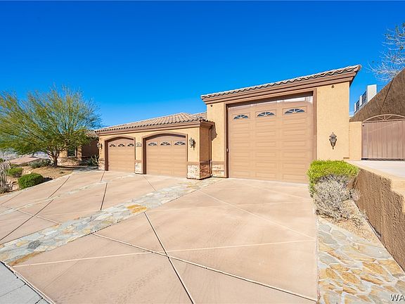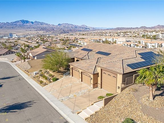 Experience the height of contemporary luxury and privacy in this custom estate with spectacular city light views of Laughlin.This exquisite home boasts nearly 3600 square feet of expansive open concept living. Entertain guests and enjoy seamless indoor-outdoor living in its own private backyard oasis complete with a gorgeous pool, spa, sit up tiki hut bar, multiple fire pits, water feature and unobstructed sunset views.This home also includes the lot next door for even more space and privacy. You will be welcomed by a double iron door entry with expansive views of the valley, this home is equally suited to grand-scale entertaining and day-to-day relaxation. Joining living and dining areas with a gourmet kitchen, featuring granite counters, huge center island, top-of-the-line appliances and surround sound. High-end finishes and craftsmanship are displayed throughout, from 24x24 slate floors to the many built-ins, and coffered ceilings. The flexible layout includes a large guest suite and dedicated office or additional bedroom. The primary suite boasts a private door to the patio and generous walk-in closet with a spa-quality bath, double sinks, water closet, soaking tub, separate shower, and view access. This home features nearly 4000 square feet of garage space and can fit up to 10 cars or your largest RV and still room for all the toys! The RV garage is over the top amazing and even has air conditioning to stay cool during the warmest days of summer. This home has solar to maintain low energy costs. Enjoy a day on the river or easy ATV access to an abundance of desert trails, and come home to this gorgeous home with all the comforts and conveniences of luxurious living. !! RV GARAGE DOOR 14ft IN HEIGHT. WELCOME HOME!