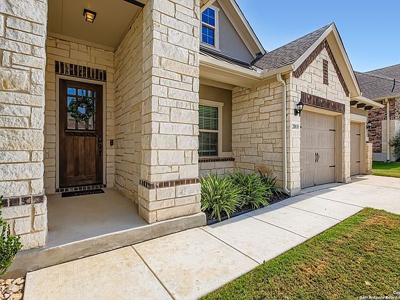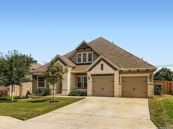 Welcome to your dream home in the highly sought-after Sunday Creek at Kinder Ranch! This meticulously maintained 4-bedroom, 3.5-bathroom one-story beauty offers luxury, functionality, and space for everyone. Step inside to find wood-look tile floors flowing through the main living areas, adding warmth and durability. The chef's kitchen is a showstopper with an oversized island, gas cooking, and designer touches throughout - perfect for hosting and everyday living. Enjoy the elegance of custom wainscoting in both the dining and living rooms, and take advantage of the multiple bonus spaces, including a private office, flex room off the kitchen/living area, and a fully equipped media room complete with movie chairs! The spacious primary suite is thoughtfully separated from the secondary bedrooms and features a large ensuite bath, offering the perfect retreat. Outside, entertain with ease under the covered patio, surrounded by professionally designed landscaping and a fun playscape that makes the backyard enjoyable for all ages. Located minutes from top-rated schools, quaint Bulverde shops, and local dining, this home offers the perfect blend of comfort and convenience.