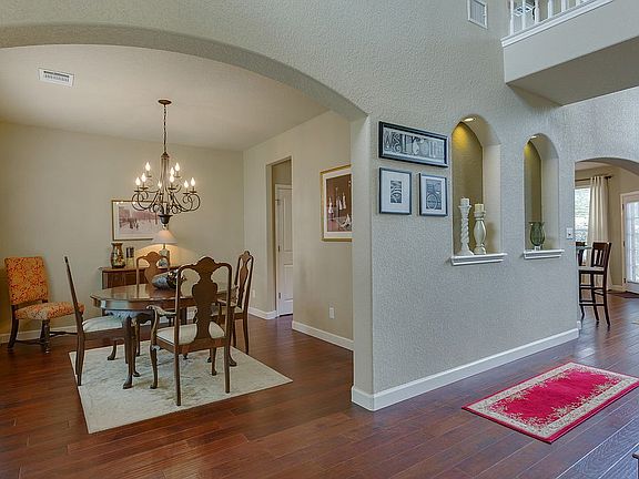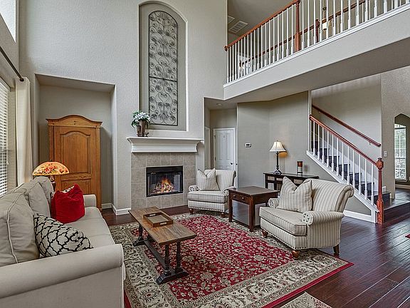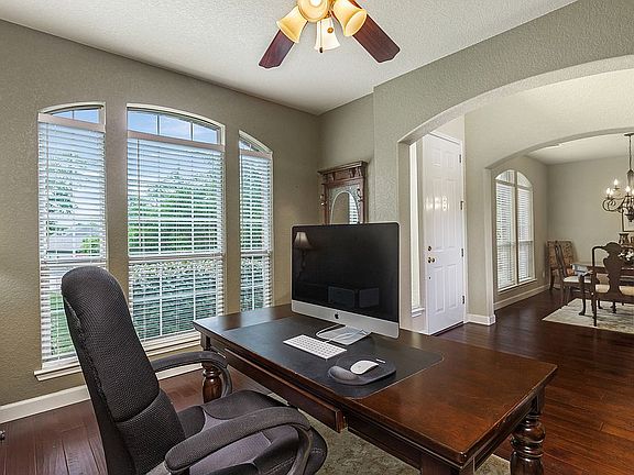 Exceptional curb appeal with a Brick & Stone exterior on parklike 1+/-acre! Light filled interiors accent the hardwood floors on the lower level with entry flanked by dining and study. Soaring ceilings in the living highlight the floor-to-ceiling fireplace and overlook the large covered outdoor area. Cook's kitchen and breakfast area offer entertaining options while private master offers a retreat. Spacious secondary bedrooms plus a media/game room are up. Expansive backyard has room to play or for a pool !