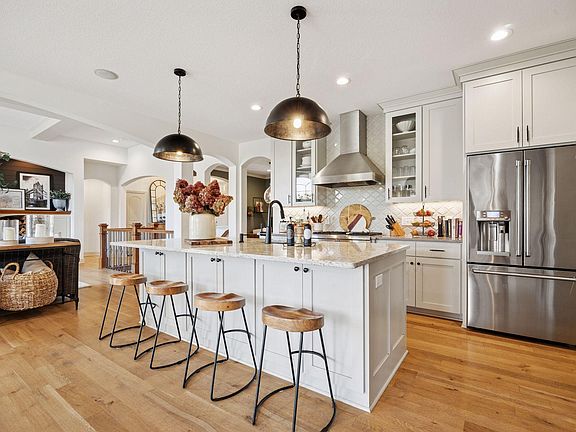 Nestled in the serene enclave of The Lakes at Northwest Shores, the home offers an unparalleled blend of elegance, comfort, and natural beauty. This former Hanson Builders model home, built in 2004, spans an expansive 3,574 square feet on a generous 0.36-acre cul-de-sac lot, with 4 beds, 4 baths, and a host of upscale recent upgrades that make it truly stand out. Step inside to an open-concept main level flooded with natural light, where a cozy gas fireplace anchors the living space, perfect for chilly Minnesota evenings. The gourmet kitchen dazzles with stainless steel appliances and granite counters and flows seamlessly into a sunlit dining area. Retreat to the luxurious primary suite, featuring a spa-like en-suite bath, or unwind in one of the three additional bedrooms, each with ample closet space. Main floor laundry room lets you take care of the chores easily without extra steps to the lower level. Outside, your private oasis awaits with breathtaking western exposure and sunsets overlooking the tranquil Sunrise Lake and a quiet city park. Enjoy 84 feet of pristine shoreline, a beautifully landscaped yard, and an inviting firepit—ideal for summer barbecues or stargazing. The exterior blends timeless charm with durable stone, stucco, and brick accents, complemented by a 3-car attached garage for effortless storage. Located in Blaine's sought-after Northwest Shores, you're minutes from top-rated schools, shopping, and easy access to 35W for a quick commute to Minneapolis or St. Paul. Embrace lakeside living at its finest—where every day feels like a vacation up north.