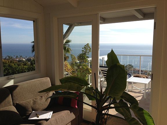 Laguna Beach chic beach house top floor unit in Upper Victoria Beach duplex. Sunsets year round, unobstructed 180 degree white water full ocean, Catalina & San Clemente Island view. Very large entertaining west facing ocean view deck. Full ocean view from living room, dining room and kitchen. Hardwood floors throughout. Large open upgraded designer kitchen (Bosch, Blanco, all stainless steel appliances), eat at island for 4, dining room, open floor plan and wood burning fireplace. 2 good size bedrooms (king & queen) with large walk in closets. Extra storage, back garden, large one car garage, outdoor hot shower. Short walk to Victoria Beach. Private, secure, separate entrance with gate. Agents welcome. Call Katrina on for a showing or further information.