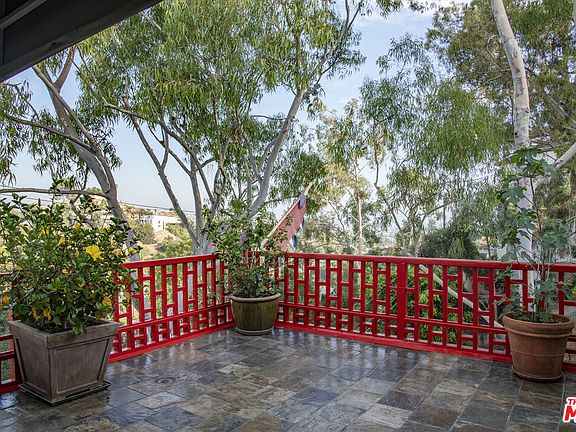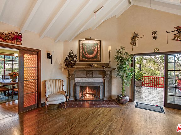 This magical estate, perched in the legendary Hollywood Hills, is a four-story architectural masterpiece and includes something very rare in the hills; when you step outside your kitchen door, it's onto your 6495 sq.ft. terraced, private park complete with fruit trees, a large raised bed vegetable garden, and cozy, private patios draped in shade by a huge 100-year-old oak tree. This is not just a home, it's a sanctuary above the fray, a living love letter to Classic Hollywood with a view of the iconic sign right outside your front door. Designed by acclaimed architect W. L.Schmolle and built by a renowned structural engineer, this 1948 castle blends timeless elegance with soul-stirring charm. Step through the front door and into a world of grandeur. Soaring 14-foot vaulted ceilings, a marble-clad wood-burning fireplace, and expansive picture windows open to panoramic views from Griffith Park to Long Beach. French doors lead you outside to a 400 sq. ft. entertainer's terrace with yet another fireplace, slate floors, and treetops swaying in the breeze. Every inch of this home whispers craftsmanship: hand-milled black walnut from Michigan, custom pocket doors, leaded glass windows, and subtle elements of Feng Shui which keeps the energy flowing freely. The chef's kitchen is a modern marvel with an Italian Bertazzoni range, stainless appliances, and ambient lighting that makes every culinary moment magical. Wander through one of the secret passageways and find yourself in the turret, a three-story tower where you'll discover an intimate lounge leading to a sun-soaked veranda, above that a circular meditation space and a bonus bedroom nestled beneath a skylight. Its like something out of a fairytale. The primary suite is expansive with views from every window, 2 large walk-in closets, and a Juliet balcony. The main bath has been completely redone, featuring dual marble sinks and heated floors. There is abundant storage space throughout the home, including a separate wine room complete with a 170-bottle EuroCave wine fridge. An 800 sq ft guest apartment with vintage O'Keefe & Merritt stove, clawfoot tub, and two private entries occupies the home's lower level offering even more opportunity for gracious living and creativity. Next to the property, a short walk down an historic stairway brings you to the charming Beachwood Village Square with its shops, market, and restaurant. Hiking trails to Lake Hollywood are right outside your front door, as well as access to horseback riding at Sunset Ranch. This is more than real estate. This is your storybook home! A private paradise.