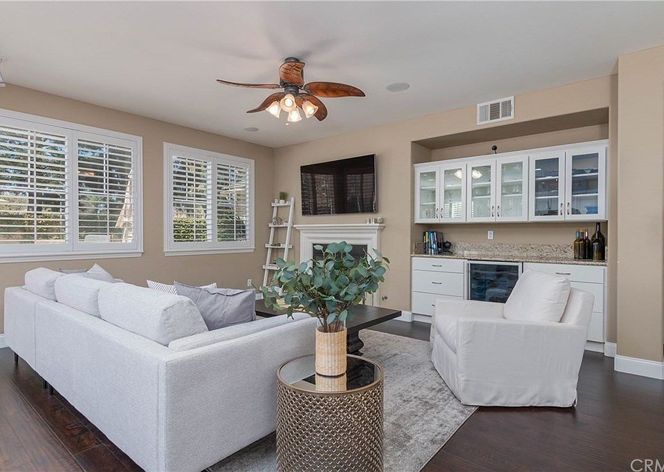 Welcome home to 28822 Lexington Road! A charming front porch greets you and sets the tone for the beautiful interior appointments throughout, including wood laminate flooring, custom shutters, and high baseboards. The main entryway is highlighted by a sitting room, a main floor office (4th bedroom) with a custom built-in desk, an upgraded bathroom, and the formal dining area. The family room is highlighted by a gas fireplace, a built-in bar area, and opens to the entertainers kitchen featuring white cabinets, granite countertops, SS appliances, a desk workspace, and the kitchen nook offering sliding door entry to the backyard. In the well-appointed backyard you will find a bubbling jacuzzi, a built-in BBQ area, a tranquil fountain, a cozy fireplace, and a grassy area for play. The 2nd story of the home offers 2 spacious secondary rooms, a secondary bathroom with dual vanities, a large flex space, the laundry room, and the large master suite which is accented by a gas fireplace and the master bathroom which features a large soaking tub, a separate stand up shower, plus a spacious walk-in closet with custom built ins. Located in the Harveston Community offering it's residents resort like amenities including: a 17 acres lake, multiple parks and play areas, a Community Clubhouse, a Junior Olympic sized pool with splash park, and a 19-acre sports park, plus conveniently located near shopping, dining, freeway access, and entertainment this is a home that you don't want to miss.