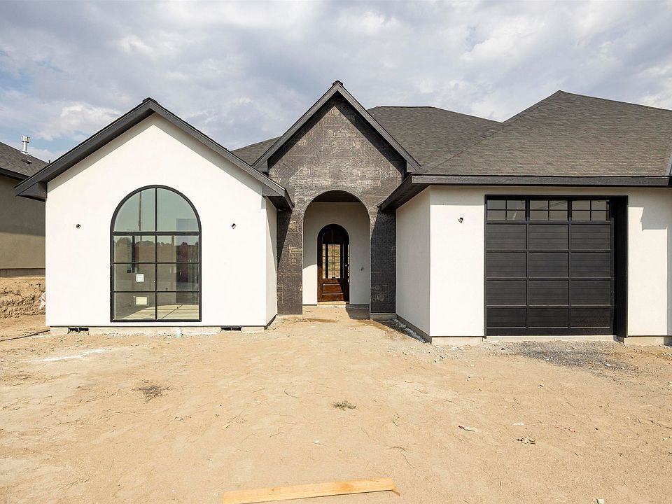 MLS# 285006 Welcome to this beautiful organic modern style rambler, thoughtfully crafted and located in South Orchard community. Nestled on a spacious lot, this 2,615 sq ft home offers 4 bedrooms, 3.5 bathrooms, and the perfect blend of style, comfort, and functionality. Step into the welcoming entryway, where you’ll find a convenient powder bath for guests and a private Jr. suite featuring vaulted ceilings, a full bathroom, and a walk-in closet. The expansive great room boasts soaring vaulted ceilings and a striking tiled gas fireplace, seamlessly connecting to the chef-inspired kitchen, which features an oversized quartz island, stainless steel appliances, white oak cabinetry with crown molding, and durable LVP flooring throughout. The functional layout continues with a spacious walk-in pantry, mudroom, and an oversized laundry room complete with extra storage, folding counters, tile flooring, and a utility sink. Two guest bedrooms are set up in a Jack and Jill layout, offering privacy and comfort for guests. The luxurious primary suite includes a large walk-in closet, dual vanities, a fully tiled shower, and a freestanding tub—perfect for unwinding. Throughout the home, you’ll find stylish black Andersen window frames and designer finishes. Additional features include a nearly 900 sq ft insulated garage with modern clear glass doors and a fully landscaped yard with underground sprinklers, sod, curbing, and rock accents. There will be a 400 amp electrical panel and also surround sound in living room and patio. The estimated completion date is at the end of August 2025. Located just minutes from freeway access, Country Mercantile, and local amenities, this home is a must-see.