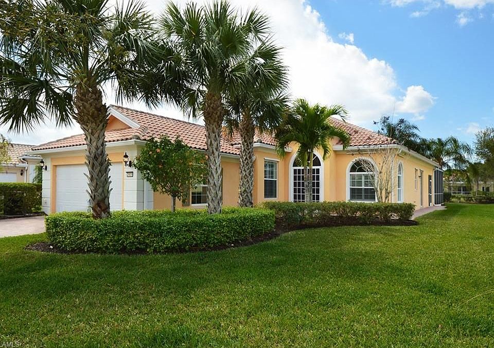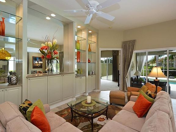 H.11758 -This home is situated on an extra wide premium homesite close to the cul-de-sac giving you lots is space between you and your neighbor. One of the last "Built Solid" Oakmonts in Villagewalk of Bonita. This home is poured concrete with steel reinforced construction, porcelain tile, central vac. You will know this house is different when you walk up to the front door, and see the tropical cut glass insert. This home has a very relaxed vibe. No White Cabinets Here!!! Light sage green cabinets with under lighting continue the monochromatic theme. The cool sage color puts you at ease inside. The kitchen is highlighted by a glass tile backsplash, and lower cabinets have pull out shelves for ease of use and maximizing storage. All windows have custom treatments all sliders have roll down "Silhouettes"to give you privacy, but still let light in. Extensive electrical upgrades with recessed eyeball lights to highlight artwork in living area and secondary bedroom. 20" tile in common areas, and den make this a low maintenance home. Owner has created an outdoor oasis in the lanai/pool area. Come see why Villagewalk is known for it's great activities and nice neighbors.