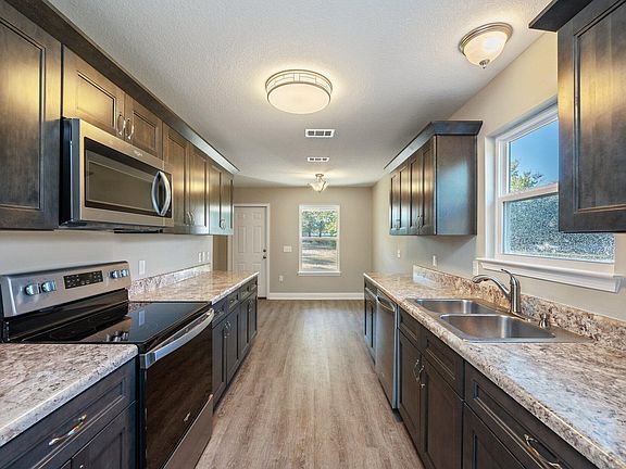Certificate of occupancy just received! Construction complete /move in ready! Huge level yard almost 1/2-acre new construction with an easy commute to Highway 85 or Hwy 90 on the south side of town! This three-bedroom two bath is complete for a quick move in! The raised ceilings in the living room and the covered back porch give these open areas a great place for a BBQ or family fun! Enjoy the huge master bedroom and master closet. Bring your garden and your family to see this new home today! Don't forget the Huge back yard! Bring your camper, boat and BBQ grill!