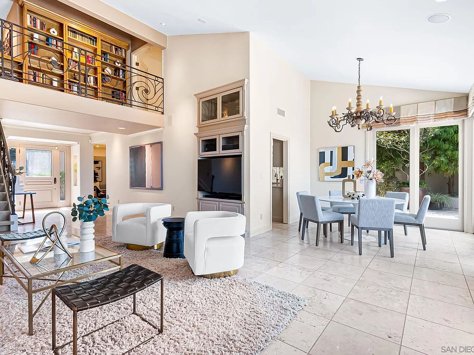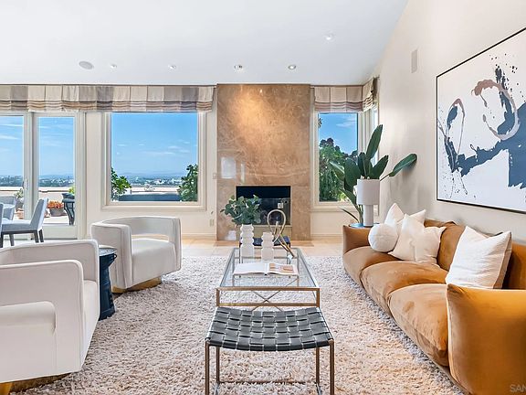 Sweeping easterly views and effortless elegance are yours from this refined residence tucked within Windemere’s exclusive guard-gated community. Vaulted ceilings, abundant natural light, and a neutral palette create an ambiance of comfortable sophistication throughout the 3-bedroom, 3-bathroom layout. Flowing living areas are ideal for entertaining and everyday enjoyment, with a well-equipped chef’s kitchen featuring quartz-topped counters, a center island, stainless appliances, and a built-in breakfast nook. The entry-level primary suite offers a large walk-in closet plus two additional closets, and a luxe stone bath with dual vanities, skylights, and a spacious shower with a floral accent wall. Upstairs, a generous bedroom and bath are connected by a catwalk overlooking the living room—lined with bookshelves, creating a cozy loft-style library. Four sets of sliding doors open to a wraparound garden patio with mature landscaping, a built-in barbecue, and a soothing fountain—an inviting setting to embrace the city lights and mountain vistas. The third bedroom is currently used as an office without a finished closet. Thoughtfully designed storage in nearly every space contributes to pristine, organized living. Residents of Windemere benefit from 24/7 guard-gated access and resort-inspired amenities including two pools, a spa, fitness center, lighted tennis & pickleball courts, clubhouse, RV/boat parking, and scenic park-like grounds with walking paths. Perfectly located in the hills of La Jolla, just minutes from The Village, beaches, and a wide array of shopping & dining.