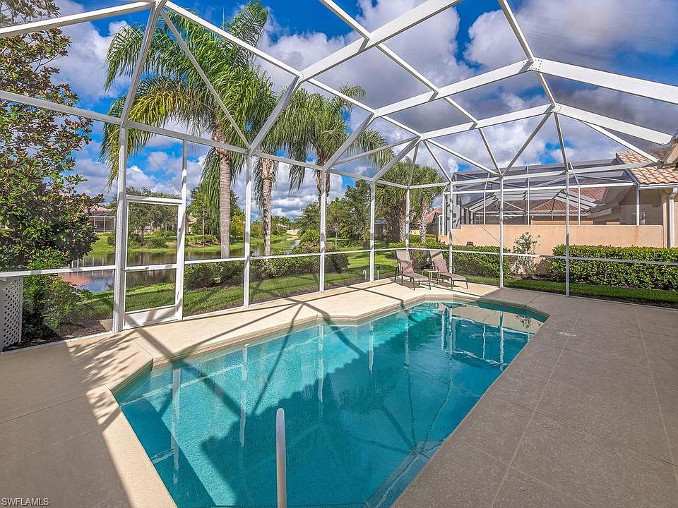 This Oakmont is special! Note the bells and whistles: long & wide lake view, plantation shutters, all tile and crown molding in social areas, accordion hurricane shutters on lanai, solid poured-concrete DiVosta construction, Robb and Stucky furnishings included!Immaculately maintained and enjoyed only a month each year. Village Walk of Bonita Springs boasts amenities galore, including a recently-renovated clubhouse, restaurant & bar,beauty salon & spa, pickle ball, bocce, large community pools, its own gas station & car wash, plus an outstanding tennis program complete with a Roscoe Tanner tennis camp. All this with low fees!