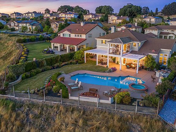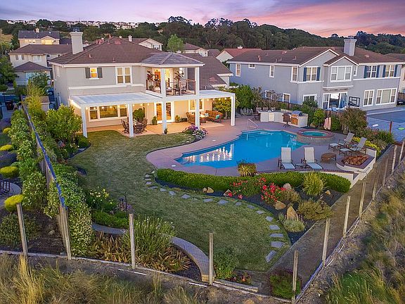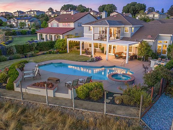 Spectacular San Francisco Bay views and 3,238SF of luxurious living await the new owners of this elegant Bailey Ranch home. There is a range of open-plan living spaces to enjoy along with a stunning outdoor entertaining area where you can admire the glorious outlook, relax in the hot tub and pool or gather around the fire pit.To the left of the entry is the beautifully appointed living and dining room while the gourmet kitchen is open to the family room with a gas fireplace. Prefer to cook and dine outdoors? The sensational patio offers a barbeque and space to host guests while no rear neighbors ensures an uninterrupted view. One bed and one bath are housed on the main level and there are two beds and one bath plus the master suite on the upper level. The luxurious master boasts a balcony where you can take in the view and overlook the pool plus there are an upper-level laundry room and a loft.