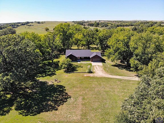 Welcome to the Flint hills on the K10 Scenic byway. This home is located just on the west edge of town. A Spacious 5 bed, 4 bath, 2 car garage With a spacious 3928 square foot, Built in 2005 with a Large country kitchen and hard wood floors . Granite countertops , 6 panel doors, Cedar Lap siding , Cozy Living room with fireplace, Large windows. Situated on 3.2 acres surround by Mature Oaks providing a serene canopy. Placed between the fork of 2 creeks. The old WPA hand dug Well & Limestone building adorns the property with Historic meaning. This land was the site of the former Historic Liederkranz Park which was a gathering place for folks in the nearby areas.