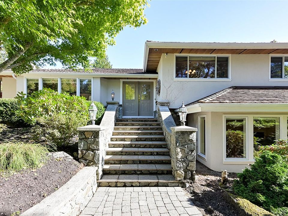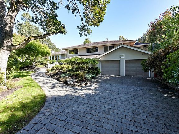 Situated in the desirable Ten Mile Point area, this well-maintained home rests on a half-acre of landscaped, terraced grounds. The upper level offers 4 bedrooms and 3 bathrooms, while the lower level includes a 5th bedroom, additional bathroom, and spacious family room. The property features manicured gardens, cedar gates, stone terraces, and a newer deck, creating a private and inviting outdoor setting. Mechanics include gas fired hot water heat w/9 zone controls, a 5000 watt emergency generator system, updated electrical & zoned irrigation system, ensuring comfort and peace of mind. A rare opportunity to enjoy a private, park-like retreat just minutes from beaches and the vibrant lifestyle of Cadboro Bay Village.