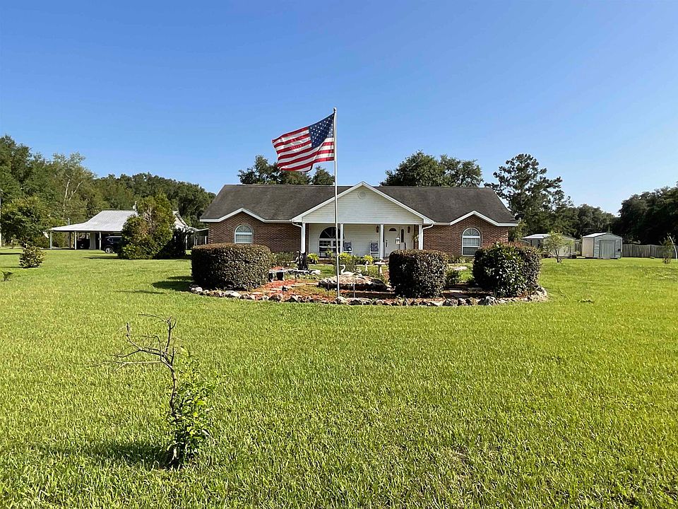 "Price Improvement" A real hidden gem in Perry, FL locate just a short drive from Tallahassee, making it the perfect home for those looking to enjoy the serenity of a smaller home town while still having easy access to the city. As you enter this gorgeous home you'll be greeted by the spacious and inviting living room that is open to a kitchen and dinning area great for dinner with family and friends. This home features beautiful built-ins, spacious bedrooms, and two full bathrooms, providing ample space for all. Enjoy the serene and peaceful covered back patio and front porch overlooking a 5 acres panoramic view of fruit trees and more. Great for outdoor activities, gardening or just relaxing. In addition to the oversize 1 car garage/workshop with a rolling bay door, the property includes 2 large carports, and two storage units, both equipped with electricity. With this much space there is no limit to what you can create. Schedule a viewing today and experience all this place has to offer! All measurements approximate.