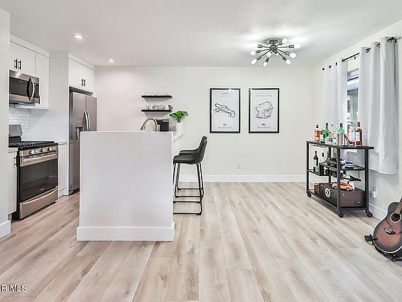 Gorgeous! Beautiful one story townhome features two bedrooms and two bathrooms. Thousands $$ spent on remodeling top to bottom. Prime location with two patios. Enter into a spacious living area with a completely open concept. Living room features recessed lighting and a striking stone fireplace with glass doors and crushed glass inside. Custom kitchen cabinetry, quartz bar and countertop, and stainless steel appliances. Modern wood-like flooring throughout and all windows replaced and sliding doors. Enhanced hardware throughout. Master bedroom has an en suite bathroom with a beautiful walk in shower. Second bathroom features a dramatic black marble surround tub/shower and added custom glass enclosure. One patio is directly off living area. The second patio directly off master and features fold down fencing for views. inside laundry space. There is also a community pool and clubhouse close by. Beautiful Chumash Park surroundings and a drive down Kanan to the beach. Live and enjoy the California lifestyle!!