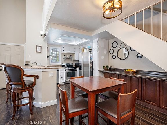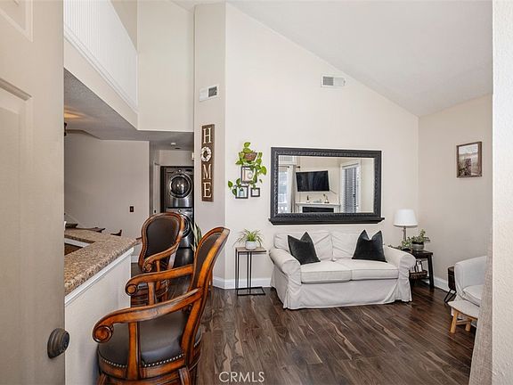 The charming 2-bedroom upstairs unit, featuring a large loft, which can be used as an office or third bedroom, boasts a beautiful open floor plan with laminate flooring throughout. Being an upstairs end unit, it offers stunning views of the pool area and mountains. The kitchen is equipped with upgraded stainless steel appliances, and the home has an abundance of natural light with neutral colors throughout. Additional amenities include a stacked oversized interior washer and dryer, and a one-car garage with a side door entry for easy access. The property is located within the boundaries of award-winning schools, Portola Elementary, Serrano Middle School, and El Toro High School. It is also conveniently situated near a beautiful park with workout stations and offers access to great trails for hiking and biking. This home is perfect for a first-time home buyer or a great rental investment property. The location provides easy access to the 241 toll road, Cooks Corner, Whiting Ranch Wilderness Park, and shopping in Foothill Ranch, which includes several restaurants, and a movie theater.