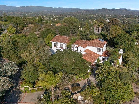 Welcome to 28889 Anderson Court, an enchanting Spanish Mission-inspired residence perfectly sited on 2.14 acres for the ultimate in privacy. From the moment you arrive via the long, private driveway and porte-cochère, you’ll feel a sense of tranquility surrounded by lush landscaping, mature specimen palms, and postcard-perfect vistas. Soaring views to the south and west create an incredible light orientation and a front-row seat to nature’s beauty—complete with abundant wildlife and magical ocean and sunset views. The elevated setting, perched at 1750 feet above sea level, offers a unique microclimate, ideal for vibrant landscaping and future expansion opportunities. Inside, the home spans four bedrooms, including a spacious primary suite with panoramic views and a generous closet. Designed with flexibility in mind, the property easily lives as a three-bedroom main home plus an attached 1000sf guest suite—perfect for multi-generational living, hosting guests or as a partitioned rental unit or home office. The suite features its own private entrance, bedroom, bathroom, office and laundry hookups, plus pre-installed 220 electric and plumbing for a stove, fridge, sink, chandelier and space for a breakfast lounge. The main level boasts a grand living room with vaulted ceilings and a cozy fireplace, an oversized dining room that opens to views of the pool and gardens, and a well-appointed kitchen flowing seamlessly into a generous family room with direct access to a spacious, covered outdoor loggia. Step outside and discover an entertainer’s paradise: a sparkling pool and spa, expansive sun patios, lush lawns for play, and a private viewing pavilion overlooking the grounds. Beyond the landscaped area, an unfenced portion of the lot offers exciting possibilities to add a tennis or pickleball court, vineyard, additional guest house, or private garden retreat. Additional features include an oversized three-car tandem garage with abundant storage, room to create a wine cellar, and timeless handcrafted stone exterior walls reminiscent of historic California missions. This exceptional property is located within Rimrock Estates, an exclusive, guard-gated community celebrated for its privacy, security, and breathtaking views. Known as one of the most desirable enclaves in North San Diego County, Rimrock Estates offers a serene retreat from city life while remaining just minutes from shopping, dining, and freeway access. The community is defined by its elevated lots with sweeping mountain and coastal vistas, stunning custom homes on large private parcels, and proximity to golf, equestrian facilities, wineries, and great schools. Combining luxury living with a strong connection to nature, Rimrock Estates delivers an idyllic setting for those who value privacy and beauty. This property is far more than just a home—it’s a sanctuary. Experience the perfect blend of classic architecture, peaceful living, and endless opportunity at 28889 Anderson Court.