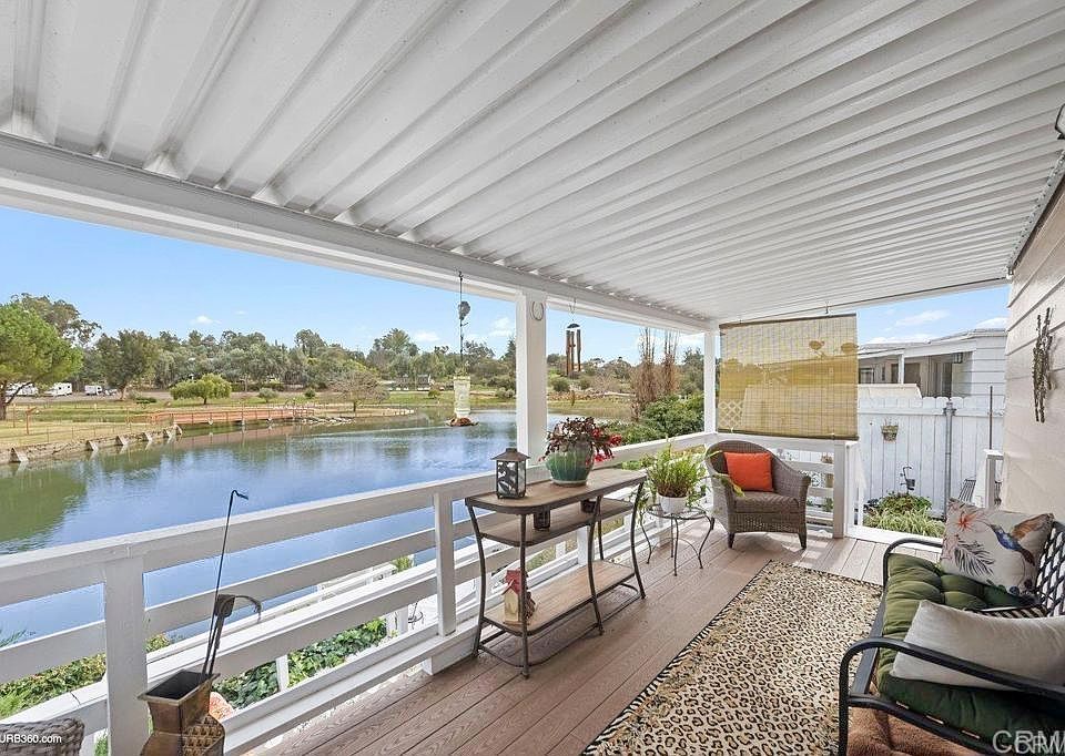 **LAKEFRONT LOCATION** Delight in the serenity of lakeside living at the gated 55+ community of Hide-Away Lake, nestled in beautiful Valley Center. This charming residence boasts frontage to a private lake with its own dock - a rare find for those who appreciate life by the water. Enjoy quiet moments watching the sunrise over the lake or engage in leisurely activities right from your backyard. Upon entering this well-maintained abode, you will be greeted by vinyl windows that let in plenty of natural light. The interior has been tastefully updated with brand new vinyl plank flooring that complements any décor style. The kitchen was remodeled just two years ago and features modern amenities for all your culinary needs. The comfort does not end there. Two years ago, fresh carpeting was installed adding another layer of warmth and homeliness to this lovely dwelling. Outside, both front and back Trex decking provide durable outdoor spaces where you can relax or entertain while soaking up the beautiful surroundings. Valley Center offers residents a blend of rural charm and suburban convenience. It's known for its local wineries and organic farms offering fresh produce year-round. Outdoor enthusiasts will appreciate numerous nature trails for hiking or biking as well as golf courses for those seeking leisurely pursuits closer to home. Shopping centers, healthcare facilities, restaurants serving diverse cuisines are all within easy reach ensuring everyday necessities are never far away. *The park is beautifully maintained and offers a rain-fed lake, walking trails, dog park, clubhouse with billiards table, library, pool, laundry room & exercise area. Monthly space rent is $775. The park bills for sewer fees, currently at $31.75. Natural gas and water are metered by usage and billed by the park. Electric is separate and billed through SDG&E. Buyers will need to have as minimum credit score of at least 700 and make at least 3 times the space rent for monthly income to qualify. Park applications must be completed and accepted before making an offer to buy.*