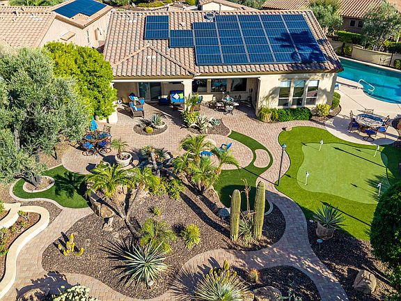 Discover this rare ''Libertas'' model with Casita in the 55+ community of Trilogy at Vistancia. Offering 3 bedrooms, 3 baths, and an extended 2-car garage, this home is designed for entertaining with a pergola-covered courtyard, oversized lot, and resort backyard featuring extended patios, misting system with retractable shades, lush landscaping, putting green, firepit, outdoor lighting, pool, and heated spa. The chef's kitchen boasts staggered cabinetry, quartzite counters, large island, wall ovens, gas cooktop, wine fridge, and pull-out drawers, all open to a great room with custom stone entertainment wall, fireplace, and surround sound. The owner's suite offers a barn door, dual sinks, walk-in shower, and custom closet. Additional features include solar lease, newer A/Cs, garage cabinets, epoxy floors and a mini-split, laundry room cabinetry & laundry sink, and so much more!