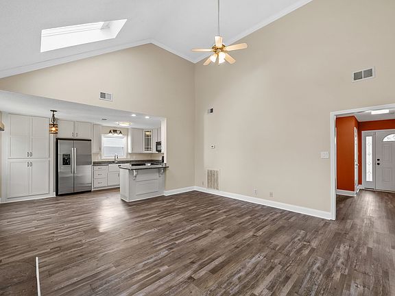 Huge farmhouse sinkBrand new roofHuge covered patioStorage areaDouble trashcan spaceVaulted ceilingWhite kitchen cabinets
