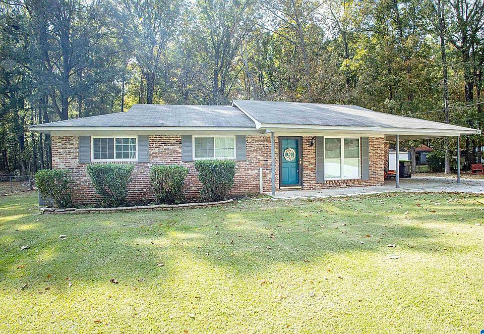 Charming 3 bed house with open great room, updated kitchen, LPV flooring , separate laundry room, covered back porch, carport, fenced backyard with private wooded area beyond, and storage building.