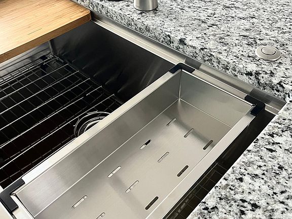 Granite countertops and a beautiful deep farmhouse sink with accessories of a cutting board, drying rack and strainer. Walk in pantry.