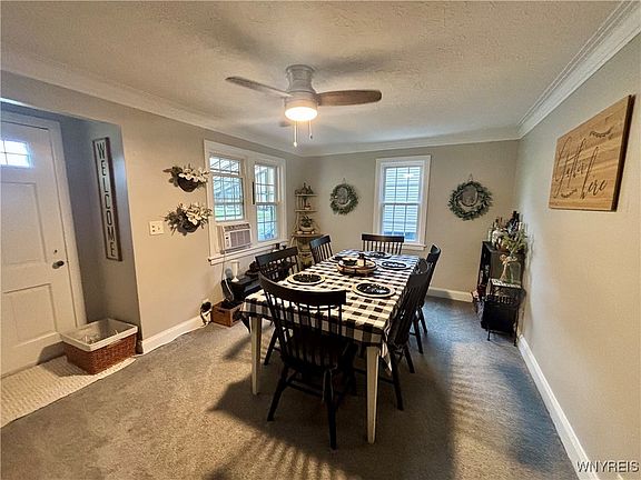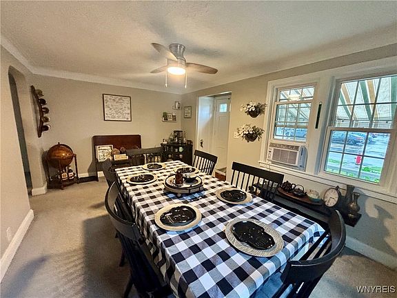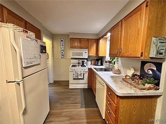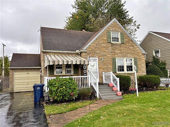 Situated in South Buffalo, this stone & vinyl sided Cape features front porch with awning, formal living room (currently used as a dining room), updated fully equipped kitchen leading to the large family room/dining room, 2 bedrooms on first floor with hardwood floors, updated full bathroom with tub surround with built in baskets & shelves, the primary bedroom on second floor is huge with private 1/2 bathroom plus walk-in closet, some replacement windows, full poured concrete basement with glass block windows, attached garage, and fully fenced back yard with shed. Seller reserves the right to set a deadline.