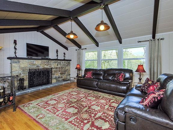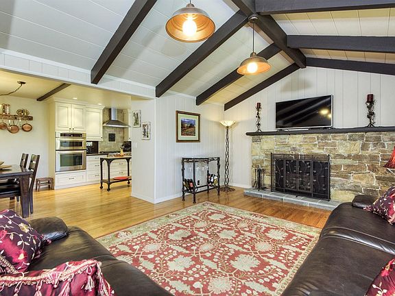 This single level ranch home, approx. 1800+ sq. ft on tree-studded 1.25 acre has been totally remodeled with high end materials. Very private setting, yet 12 miles to town. Cozy living room with large stone fireplace. Master bedroom suite has its own sitting room opening to deck and backyard and a walk in custom closet and spa bathroom. Rooms are bathed in filtered light, no need for window coverings. 2 guest rooms, small office, inside laundry room, 2 car garage attached to house by covered breezeway.
