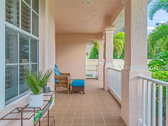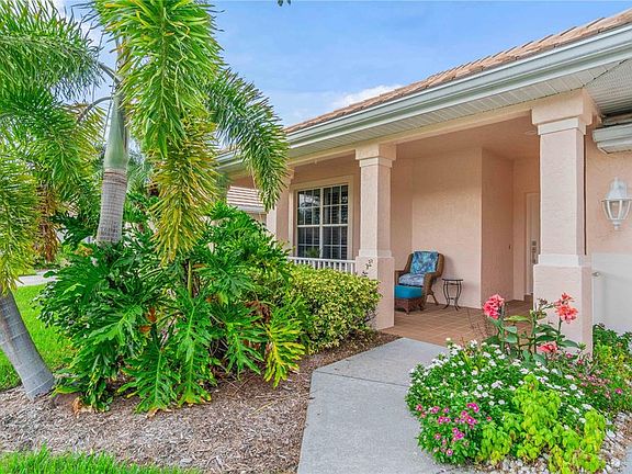 Enjoy this private gated and beautifully landscaped community with sidewalks, pond fountains, park benches, and lantern-lit streets. This recently painted, meticulously maintained home is at the end of a private cul-de-sac and offers the perfect blend of comfort and style. Inside, you’ll find move-in ready 3 bedrooms, 2 full baths, impact glass windows, plantation window shutters, crown molding, tray ceilings, and updated plank ceramic tile flooring. A full-sized laundry room with cabinets and utility sink adds convenience. The covered front porch leads into a spacious foyer with arched doorways, tray ceiling and welcoming wet bar. The well-equipped kitchen is designed for entertaining, featuring ample cabinets, pull out sliding shelving, a serving island, breakfast bar, tray ceiling and dinette area. The open living space has ceramic tile plank flooring and flows seamlessly to the outdoors through triple sliding glass doors. Step onto the expansive wrap-around screened lanai with a private spa looking out to the attractive pond with lighted fountain—ideal for morning coffee or relaxing evenings. The spacious master suite with double sliders offers lanai access, a walk-in closet, and a private en-suite bath with double sinks and a Roman walk-in shower. A split-bedroom layout ensures privacy for guests, with two additional bedrooms and a conveniently located full guest bath. Quality curb appeal includes a tile roof, mature landscaping, inviting front porch, long and wide expanded driveway. Community amenities include resort-style tropical pool with sundeck, clubhouse with fitness room, library, and billiards, patio with tables and umbrellas. Whether living here full-time or seasonally, you’ll enjoy a low-maintenance lifestyle with low HOA fees, no CDD fees, and X flood zone. Centrally located just 15 minutes to Wellen Park, golf, beaches, MLB spring training baseball, boat launches, world class fishing, biking and walking paths, shopping, and medical facilities.