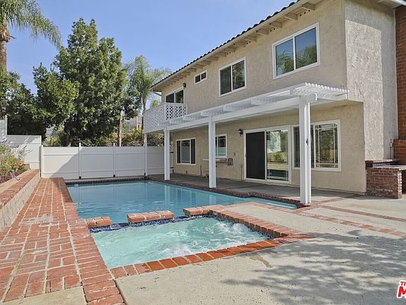 This beautiful two story pool home is located on a quiet cul-de-sac street, walking distance to award winning Las Virgenes schools, shops, parks and great restaurants. This wonderful 5 bedroom, 3 bath home features a spacious open floorplan that has been beautifully updated. The front courtyard is sunny, gated, and private. The double door entry has dramatic vaulted ceilings and leads to a large living room and formal dining room with glass doors to the fabulous rear patio with a fire pit and a sparkling pool and spa surrounded by lush tropical landscaping. Perfect for entertaining friends and family. The kitchen with modern cabinets and granite counters is adjacent to the family room with a large custom fireplace. The master suite features a large walk in closet and a balcony overlooking the grounds and a recently updated bath. Freshly painted with recessed lights and gorgeous wood flooring throughout. The fenced side yard contains oversized RV/Boat parking and has plenty of room for storage too.
