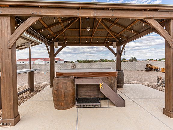 Outdoor living is equally impressive. Custom lighted entry monuments and LED landscape lighting create stunning curb appeal. A10x14 gazebo, handcrafted plate-steel fire pit, built-in Bose outdoor speakers, with large BBQ make entertaining effortless. The backyard is complete with a luxury six-person Dimension One spa, upgraded saltwater pool system with Pentair Intellichlor salt cell, and lighting for the spa and gazebo that can be controlled directly from the pool remote panel. For RV owners and hobbyists, the property features a custom RV shade structure with mezzanine storage, commercial solar lighting, and ample room for toys and projects. A hard-piped, timer-controlled irrigation system keeps the landscaped areas and fruit trees thriving year-round.