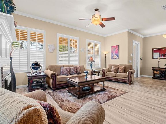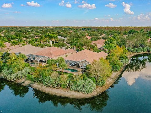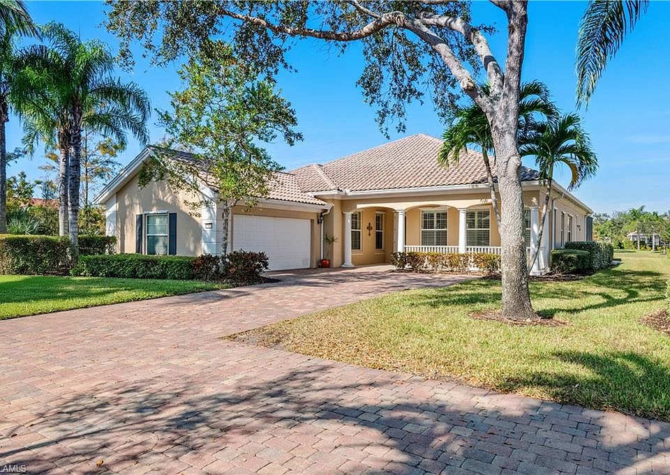 Rarely available Carlyle model situated on a premium oversized lakefront corner lot with additional parking and excellent privacy on a quiet cul-de-sac. This spacious 4-bedroom, 3-bath home features a large front porch that gives the property warm, inviting curb appeal and enhances the charm of this highly desirable floor plan. Updates include newer HVAC (2017), new hot water heater, Kinetico whole-home water system, new pool heater, an energy-efficient variable-speed pool pump, plantation shutters, electric blinds on the sliders, a screened front entry, an infrared sauna, Corian countertops, newer appliances (all updated except the stove), and updated flooring in select areas of the home. The flexible Carlyle layout provides both formal living and dining spaces, a spacious family room, and excellent bedroom separation ideal for families or guests. The screened lanai features a heated pool and hot tub overlooking peaceful long-lake views and an oversized yard that is rarely available in the community. VillageWalk of Bonita Springs offers resort-style amenities including a Town Center, restaurant/market, fitness center, community pool, lap pool, tennis, pickleball, bocce, basketball, car wash, gas pump, miles of walking paths, and low HOA fees with full lawn maintenance included. Plus, a brand-new Town Center is coming close by, bringing future dining, shopping, and everyday conveniences just minutes from your door. Homes with this combination—Carlyle model, oversized lakefront lot, pool and hot tub, extra parking, and cul-de-sac location—are rarely available and highly desirable.