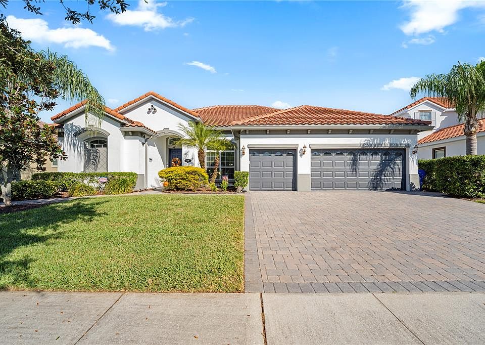 Experience resort-style living in this custom single-story pool home in the gated Mediterranean community of Avilla. Enjoy bright open spaces, 12.5 ft tray ceilings, marble and wood-look tile, and stunning pool + conservation views from the living, dining, and family rooms. Large sliders open to a spacious lanai, saltwater pool, tanning ledge, and panoramic screen—perfect for relaxing and watching the beautiful osprey, cranes and resident owl that make the woods their home. The kitchen offers granite counters, 42” cabinets, custom backsplash, prep island, bar seating, and walk-in pantry. The private primary suite overlooks the pool and features double closets and a spa-like bath. Three guest suites, a built-in office, full pool bath, oversized 3- car garage, and laundry room add convenience. Community amenities include a pool, tennis, basketball, playground, and walking paths. Prime location near The Loop, shops, dining, parks, boating, and easy access to Orlando Airport and theme parks. There's so much more.